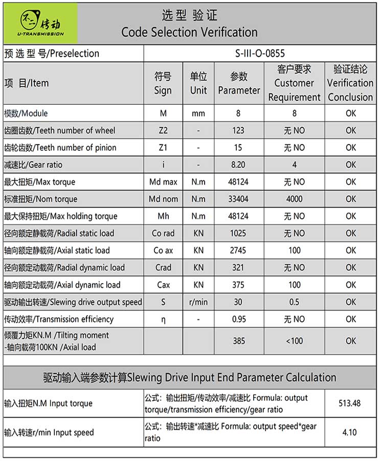 不二傳動(dòng)為客戶提供一目了然的選型驗(yàn)證文件,客戶可以通過文件清晰的得出回轉(zhuǎn)驅(qū)動(dòng)是否適用,直觀的了解每個(gè)參數(shù)的安全系數(shù),避免選型錯(cuò)誤給客戶帶來麻煩及損失。
