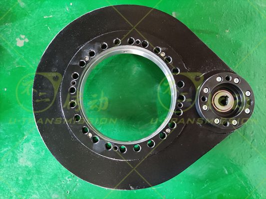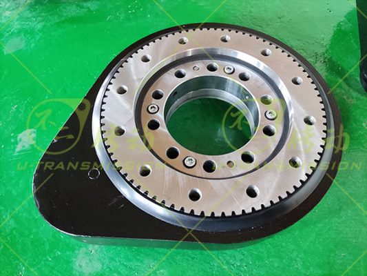 根據(jù)上述工況回轉(zhuǎn)支承按照大傾覆力矩設(shè)計,采用小游隙高精度設(shè)計,確保高轉(zhuǎn)速下回轉(zhuǎn)驅(qū)動旋轉(zhuǎn)平穩(wěn),齒采用表面感應(yīng)淬火,保證大的輸出扭矩及耐磨性能,齒芯部柔軟,具有很好的耐沖擊性,適合大慣量,大沖擊載荷。殼體采用球墨鑄鐵QT450-10鑄造而成,機械性能優(yōu)良,穩(wěn)定性高,耐磨抗震,殼體表面噴塑處理,防銹美觀,噴塑前進行磷化處理,提高防銹能力及噴塑的附著力。輸入端法蘭按照客戶馬達(dá)輸出端尺寸設(shè)計制造,客戶可以直接連接馬達(dá),給客戶提供很大的便利,減少連接部件,增加穩(wěn)定性,節(jié)約空間,縮小整機體積,降低陳本。
