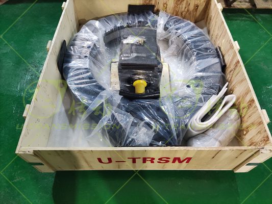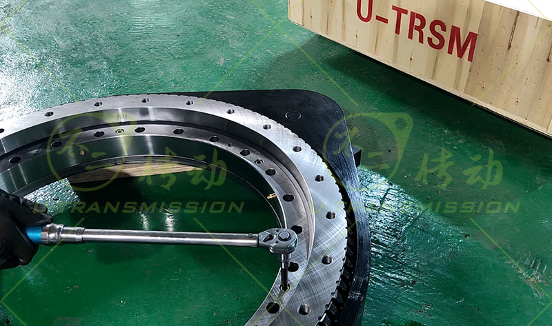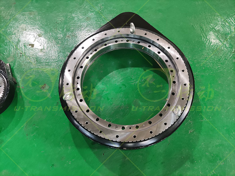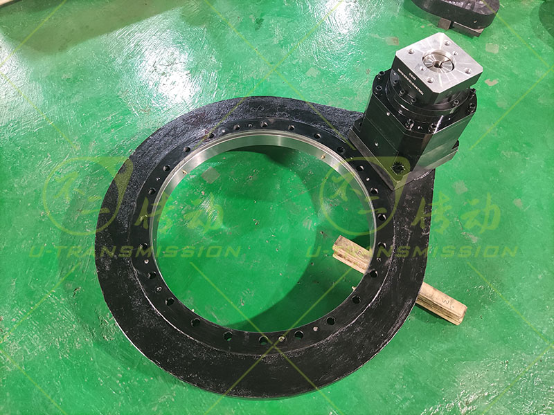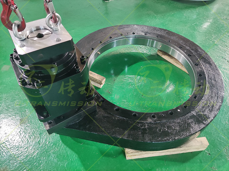 SP-III-0755 外齒大扭矩直齒回轉(zhuǎn)驅(qū)動裝置應(yīng)用在工程機(jī)械上,客戶要求輸出扭矩大,全天候使用,需要齒輪式回轉(zhuǎn)驅(qū)動,要求有剎車功能,要求低轉(zhuǎn)速,根據(jù)客戶要求,推薦了重載系列的直齒驅(qū)動,在標(biāo)準(zhǔn)的基礎(chǔ)上進(jìn)行加高設(shè)計(jì),更適合豎直安裝使用,為客戶配套了大扭矩行星減速機(jī),帶剎車的液壓馬達(dá),方便客戶安裝使用。