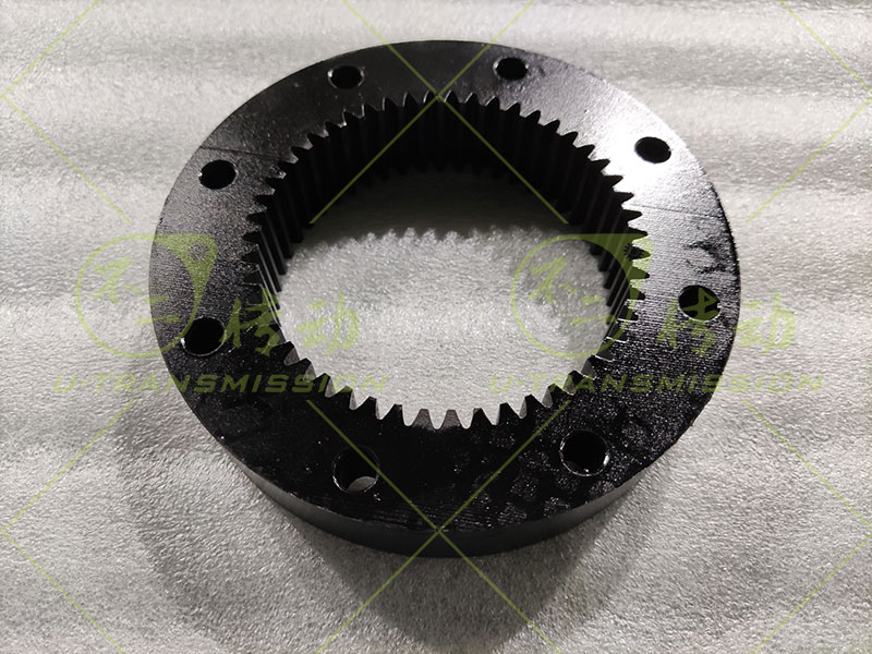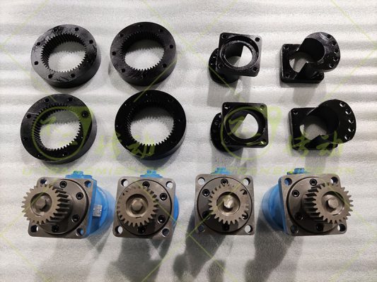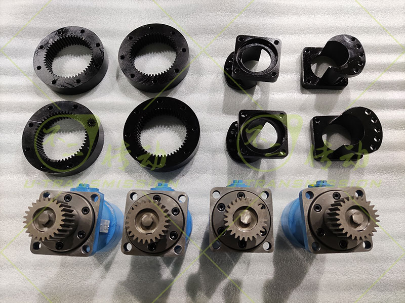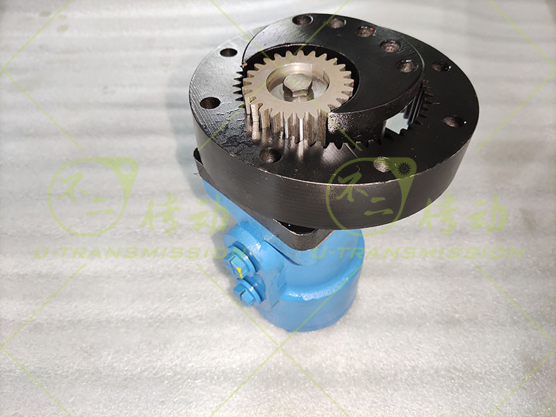 模數(shù)2的微型內(nèi)齒回轉(zhuǎn)驅(qū)動裝置應該用在旋轉(zhuǎn)裝置上,偶爾轉(zhuǎn)動90°,安裝空間非常有限,要求體積小,工作時軸向力非常大,不二傳動設計生產(chǎn)的小尺寸的回轉(zhuǎn)驅(qū)動不能滿足客戶的使用要求。因此,經(jīng)過工程師和客戶的詳細溝通,最終決定保留客戶原來的支承方式不變,給客戶設計齒輪,內(nèi)齒齒圈,配套液壓馬達,馬達支座等部件,安裝在客戶原有設備上,實現(xiàn)客戶想要的動作。