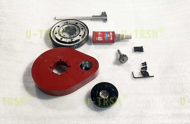 該回轉(zhuǎn)驅(qū)動(dòng)采用高精度交叉滾子軸承,軸向徑向跳動(dòng)5um負(fù)游隙,滿足了客戶的旋轉(zhuǎn)精度要求。根據(jù)載荷小,轉(zhuǎn)速低,體積小,選用模數(shù)2的小模數(shù)齒,一方面可以提高傳動(dòng)精度,另一方面可以有比較理想的減速比,最終回轉(zhuǎn)驅(qū)動(dòng)減速比5。為了減輕重量,齒圈采用了減重設(shè)計(jì),殼體采用6061硬鋁,設(shè)計(jì)階段評(píng)估的重量剛好5Kg,成品時(shí)稱重也是5Kg滿足客戶對(duì)重量的要求。