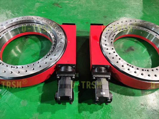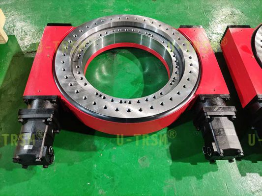 回轉(zhuǎn)支承采用42CrMo調(diào)質(zhì),蝸桿采用42CrMo調(diào)質(zhì)齒淬火磨加工的工藝,殼體使用QT450-10保證穩(wěn)定性的同時擁有高強(qiáng)度和一定的韌性,支承軸承選用國內(nèi)一線品牌,液壓馬達(dá)選擇BMV500,提供足夠的輸出扭矩,滿足客戶大扭矩的要求,馬達(dá)配平衡閥,使用更平穩(wěn),兩個馬達(dá)轉(zhuǎn)動更同步。適配法蘭設(shè)計的時候充分考慮了安裝拆卸的便利性,為后期馬達(dá)的安裝和拆卸提供方便。