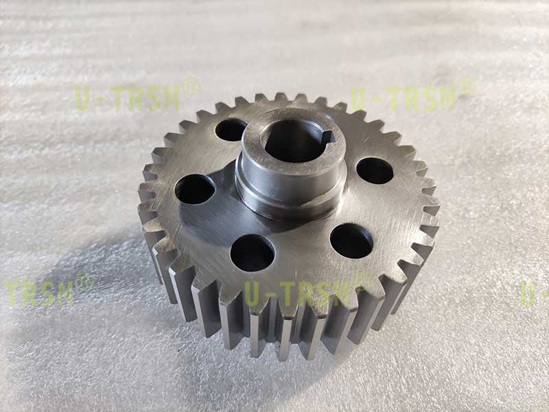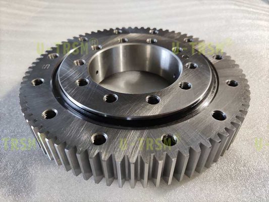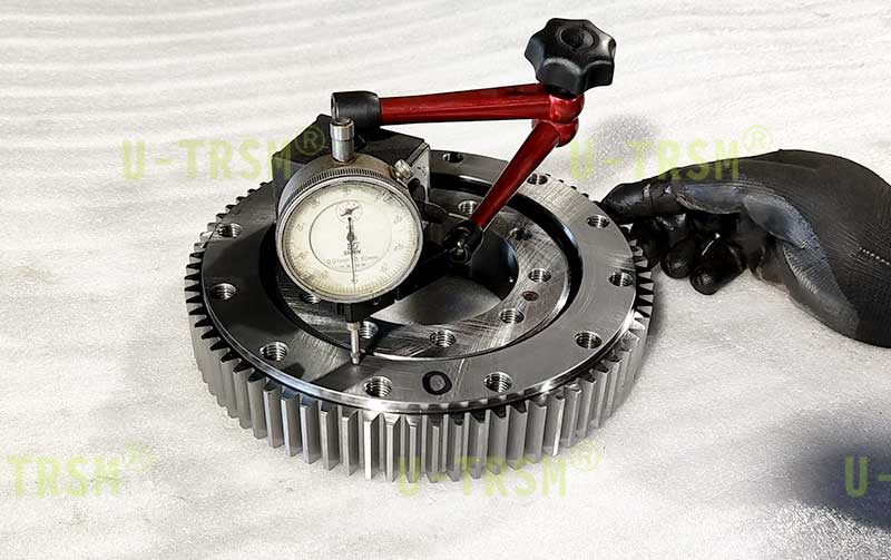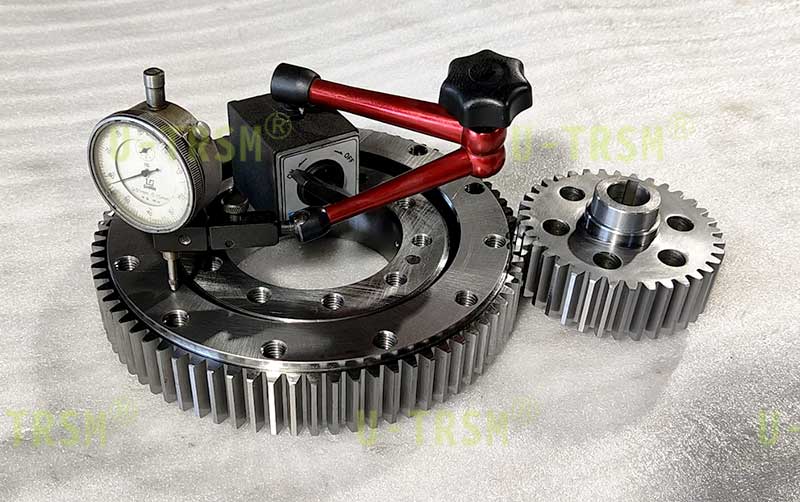 這是型號為011.16.160的精密四點球回轉(zhuǎn)支承及配套小齒輪,客戶用在自動化設(shè)備上。回轉(zhuǎn)支承和齒輪都要求高精度磨齒,并且回轉(zhuǎn)支承要求0游隙,端跳和徑跳要小于等于0.02mm,旋轉(zhuǎn)靈活。最終實測負游隙,旋轉(zhuǎn)靈活,端跳、徑跳≤0.015mm。齒輪和回轉(zhuǎn)支承齒圈均達到6級齒精度要求,完全滿足客戶的使用要求。