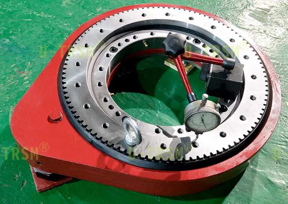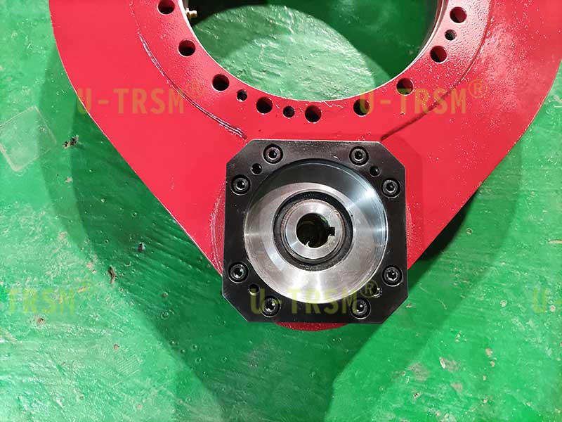 這款回轉(zhuǎn)驅(qū)動(dòng)內(nèi)部的回轉(zhuǎn)支承是負(fù)游隙,還對(duì)齒進(jìn)行磨齒加工。所謂的負(fù)游隙就是回轉(zhuǎn)支承的滾動(dòng)體和溝道過(guò)盈配合,這樣的配合可以保證內(nèi)圈和外圈之間沒有晃動(dòng),檢測(cè)表現(xiàn)為測(cè)量回轉(zhuǎn)驅(qū)動(dòng)的游隙為零,負(fù)游隙的回轉(zhuǎn)支承運(yùn)轉(zhuǎn)平穩(wěn),不會(huì)損失回轉(zhuǎn)精度。